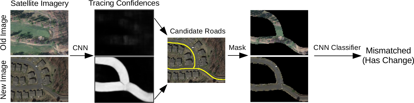 An end-to-end map update system would first process geospatial data sources to extract insights, and second leverage those insights to update and improve the map. However, prior work largely focuses on the first step of this pipeline: these map extraction methods infer road networks from scratch given geospatial data sources (in effect creating entirely new maps), but do not address the second step of leveraging this extracted information to update the existing digital map data.